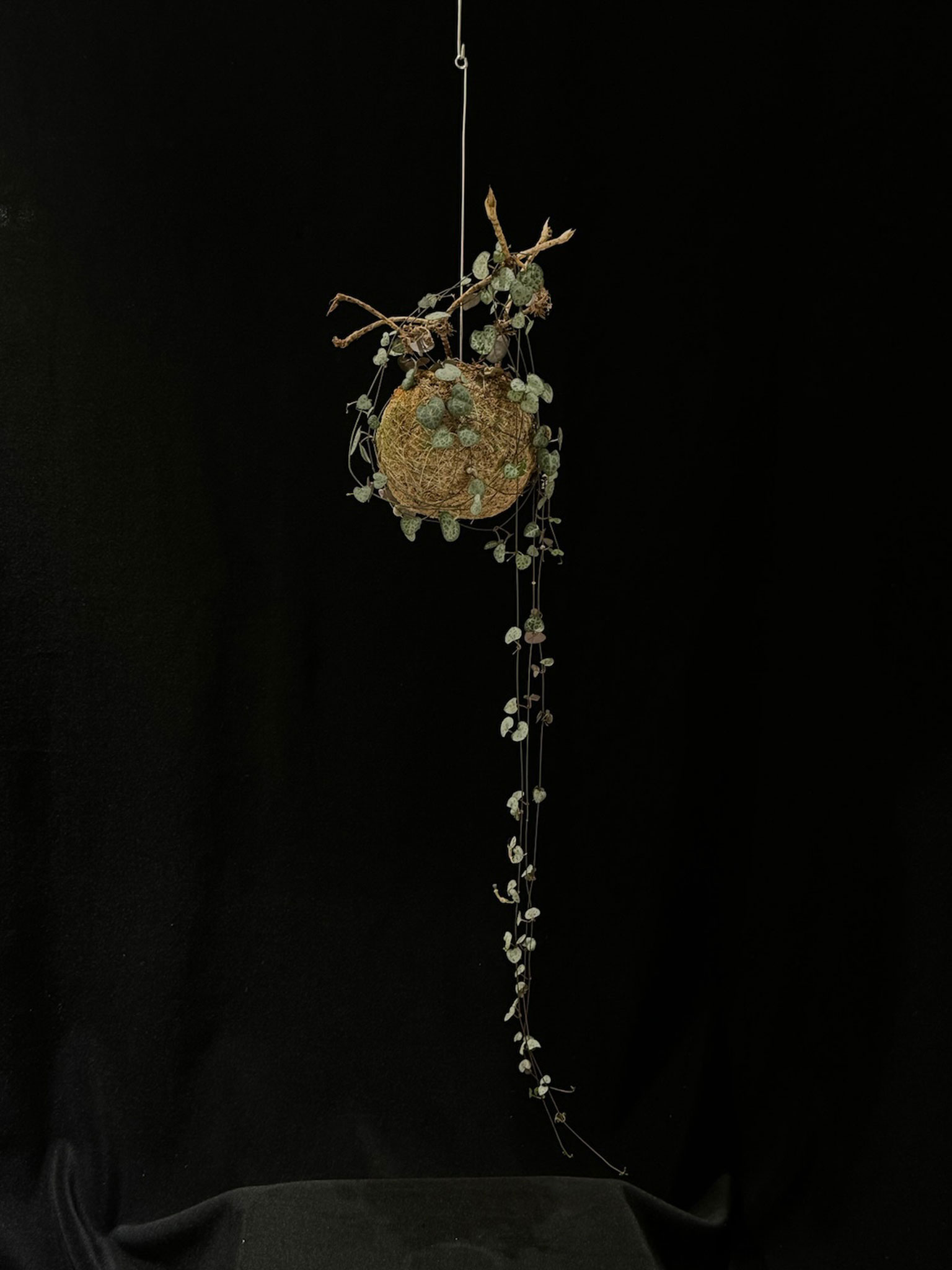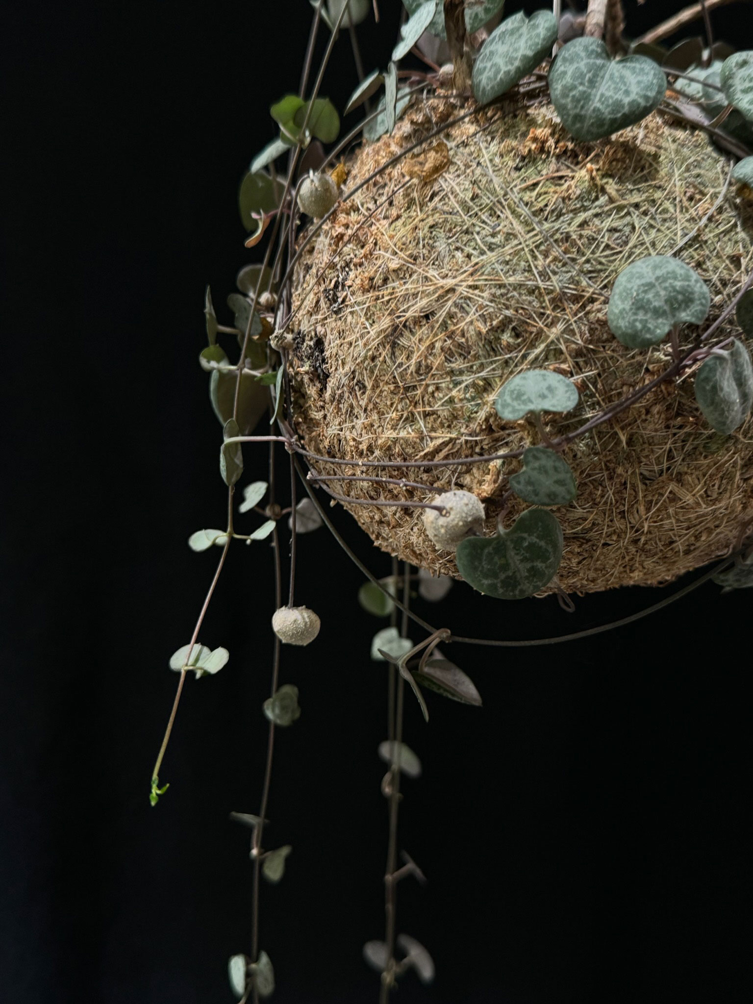 La tecnica del kokedama valorizza il portamento ricadente della Ceropegia woodii, creando un effetto elegante e leggero. La sfera di muschio mantiene un’ottima umidità per le radici, pur permettendo un buon drenaggio, essenziale per questa pianta. Perfetta per essere sospesa o posizionata su mensole e ripiani, questa varietà aggiunge un tocco naturale e sofisticato agli ambienti interni.